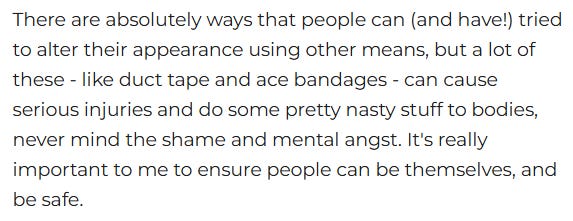 In addition, here is the Genspect information I quoted about breast binders and groin gaffs.