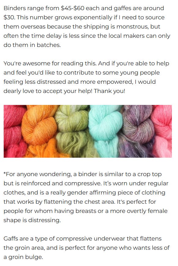 Is it sinister that free breast binders and groin gaffs are offered to kids on the quiet by a knitting yarn website?