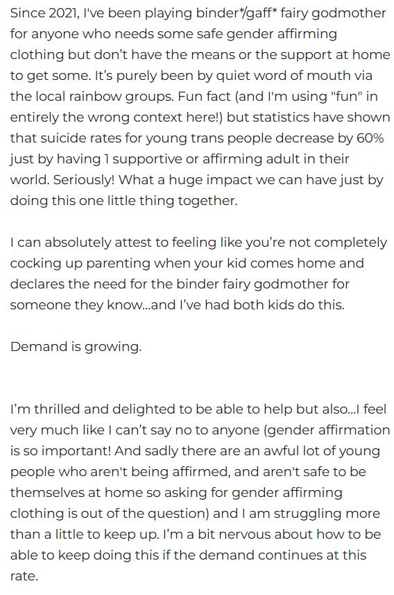 Yarn Therapy devotes a page of their website to giving away these items, no questions asked. The page is called ‘The Gender Affirming Fairy Godmother Project!’ In my opinion, that’s very much in line with all the other luring ‘love’ language used widely in the general promotion of gender ideology.