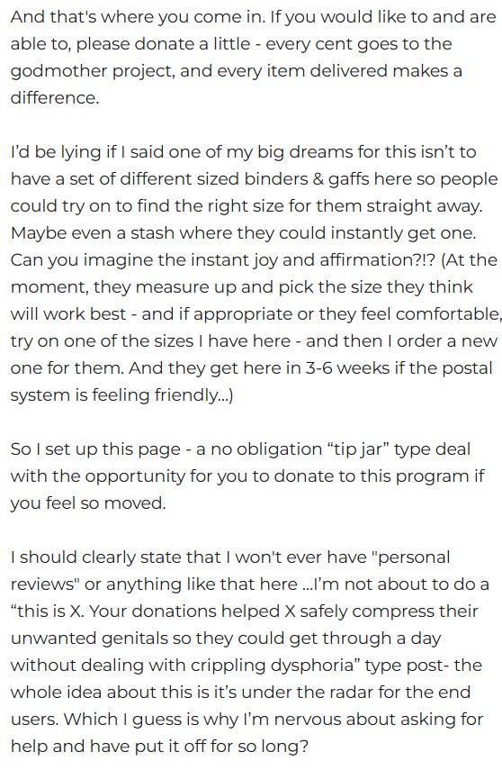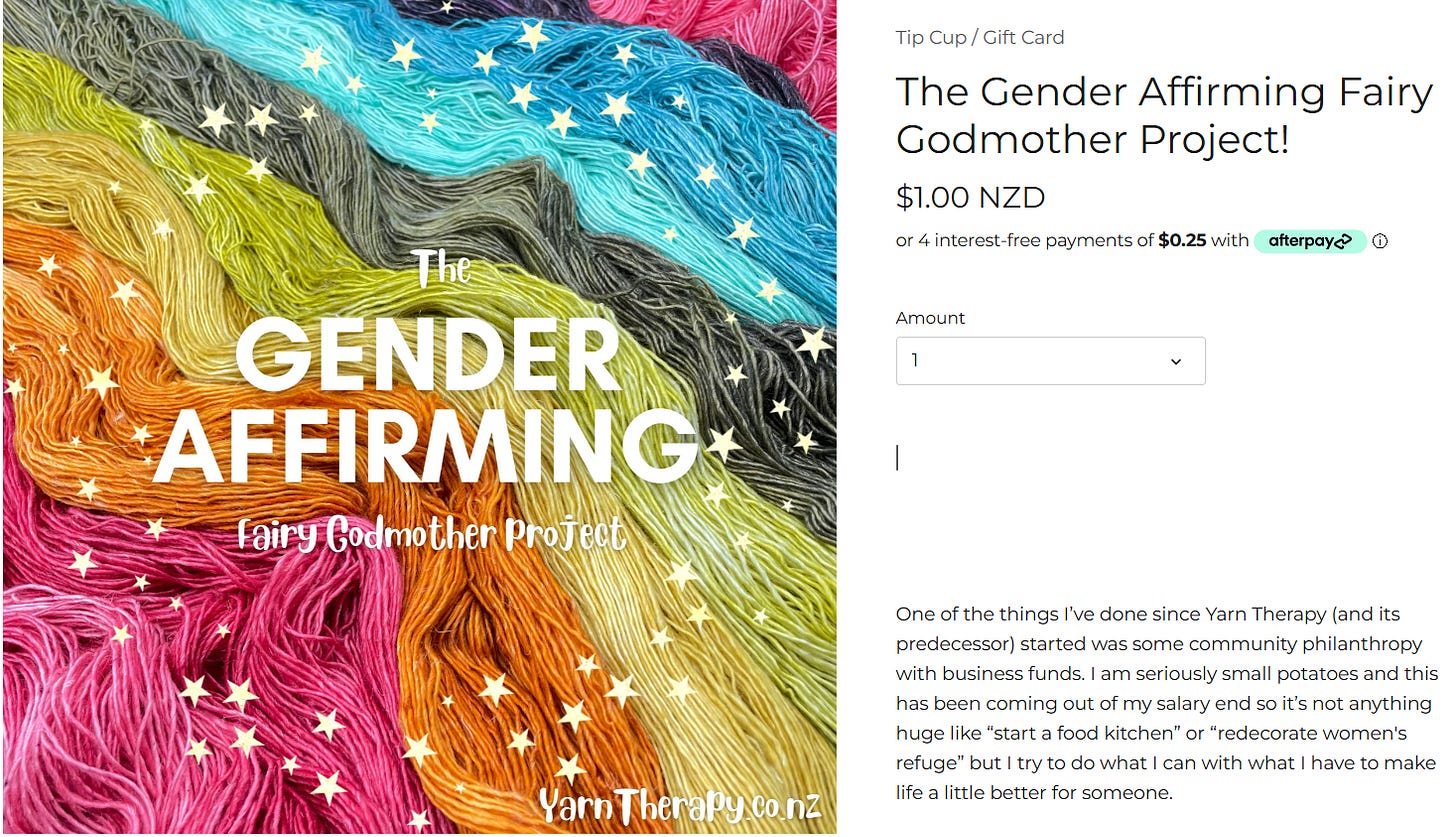 And here are the screenshots of the entire page titled ‘The Gender Affirming Fairy Godmother Project!’ on Yarn Therapy’s website at the time of publication of this blogpost -