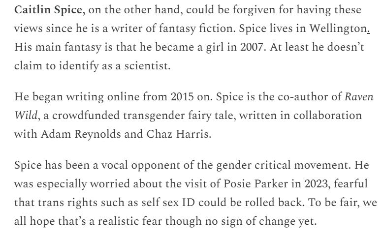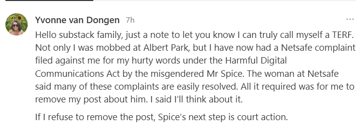 Fellow Kiwi terf, former longtime journo, and now Substack writer Yvonne van Dongen got the call from Netsafe recently. Apparently, Yvonne has word-wounded a man who says he’s a woman in one of her blogposts, and he’s made a complaint to Netsafe, New Zealand’s online safety organisation. Sounds like she must have written something devastatingly brutal.