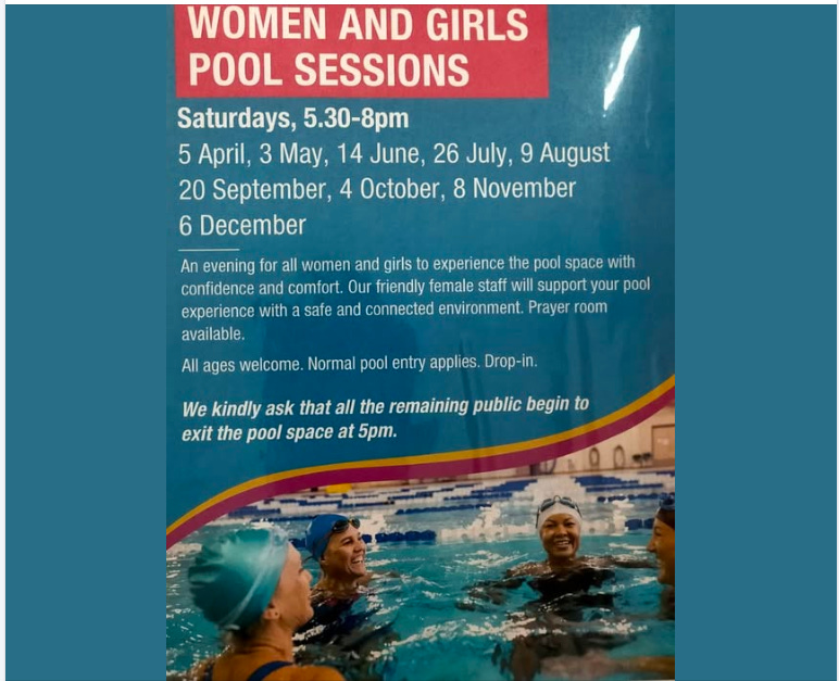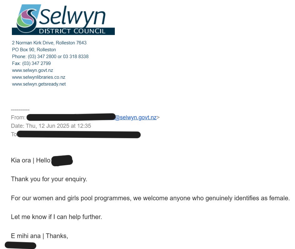 A woman visitor to Selwyn District’s Aquatic Centre saw the above poster on the wall there, so emailed a query to them asking if men who say they’re women are allowed into these sessions, although she used the term ‘transwomen’ in her query. The reply she got was “For our women and girls pool programmes, we welcome anyone who genuinely identifies as female”