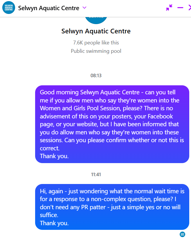 I thought I would have a shot, too, at asking the Selwyn Aquatic Centre a similar question about men in the Women and Girls Pool Sessions via the message function on their Facebook page.