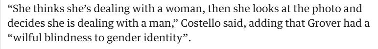 Literally taking people to court for being able to tell men and women apart. But Sal was being 'wilfully blind' by not recognising somebody as female due to hair style and choice of top?! Are we seriously supposed to walk around viewing every man with longish hair as a woman and every woman with short hair as a man? I've never heard such sexist and misogynistic nonsense!